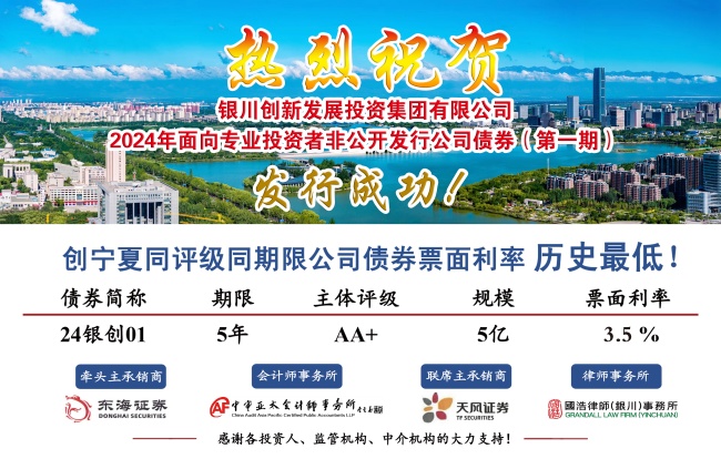 8月30日,銀川創(chuàng)新發(fā)展投資集團有限公司2024年第一期面向?qū)I(yè)投資者非公開發(fā)行公司債券成功發(fā)行。本期債券發(fā)行規(guī)模5億元,期限:5年,票面利率:3.5%,創(chuàng)寧夏區(qū)域內(nèi)5年期私募債發(fā)行利率歷史最低。本期債券的成功發(fā)行,充分體現(xiàn)了資本市場對銀川市和創(chuàng)投集團的認(rèn)可,降低了集團融資成本,為集團公司后續(xù)服務(wù)銀川市產(chǎn)業(yè)發(fā)展奠定了良好基礎(chǔ)。